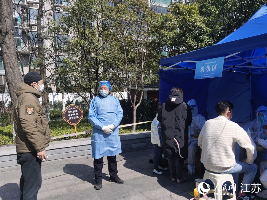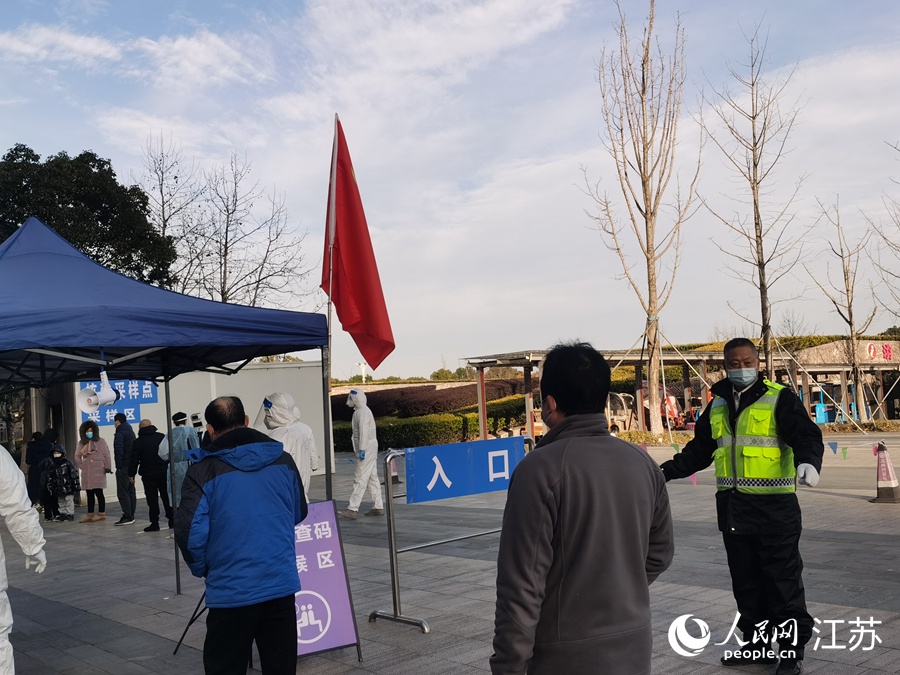 2月24日上午,在姑蘇區(qū)三香公園內,王新(中)在核酸檢測采樣點維持秩序。人民網(wǎng)記者 王繼亮攝