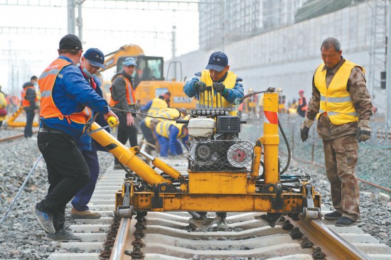 昨天上午,豐臺站改建工程計算機(jī)聯(lián)鎖封鎖施工、撥線施工開始,七百余名施工人員同時作業(yè)保障工程順利完成。本報記者 安旭東攝