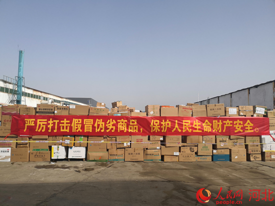 石家莊市市場監(jiān)督管理局在河北翔宇環(huán)??萍加邢薰炯袖N毀假冒偽劣商品。 張婷攝