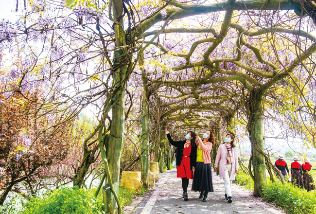 3月29日,在金華市金東區(qū)嶺下鎮(zhèn)釜章村,位于八仙溪邊的百米紫藤長(zhǎng)廊花朵綻放,紫藤花從花架垂掛下來,像一串串紫色風(fēng)鈴,吸引了一撥撥游客趁著春光明媚的好天氣前來觀賞拍照。(時(shí)寬兵)