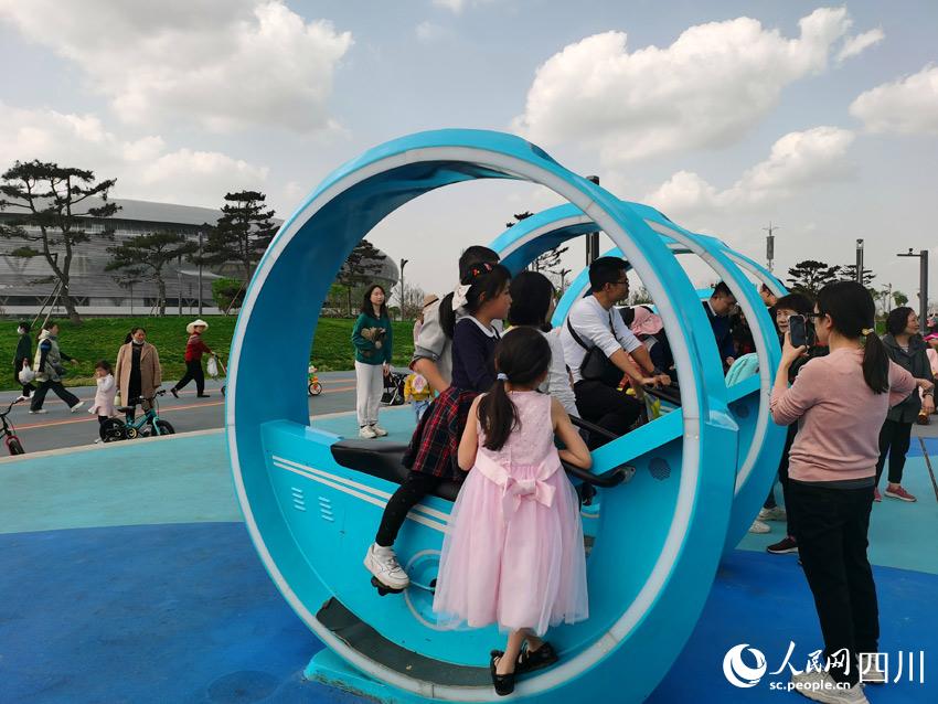 在這個(gè)“熊貓火炬手”的對(duì)面,一條“體育星光大道”綿延鋪展而來(lái)。在這條路上,每隔一段距離就會(huì)有一組圖標(biāo)和漢字,標(biāo)注著某一項(xiàng)體育運(yùn)動(dòng),如網(wǎng)球、跳水等。這個(gè)構(gòu)思,從整體上詮釋了大運(yùn)會(huì)蘊(yùn)含的眾多體育項(xiàng)目,也能讓那些偏好某個(gè)項(xiàng)目的游客找到喜歡的體育坐標(biāo)點(diǎn),提升起體育游園的氣氛。