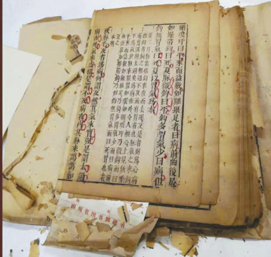 明刻版《圖注八十一難經(jīng)辨真》是近年來四川省圖書館修復的重要古籍。它是明代張世賢注釋的一部醫(yī)經(jīng)著作,刊于1510年,共八卷。袁東玨回憶,這部書是在四川省古籍普查中發(fā)現(xiàn)的。當時用報紙包著送來,打開后,她倒吸了一口冷氣:紙張老化、脆化嚴重,不少書葉已碎成渣。最小的碎片僅一厘米長,還原非常困難?!氨热?,書中‘五行相生’中的‘相’字就斷裂開來,和其他文字碎片混在一起。我依據(jù)邊欄一塊一塊對照,才最終找到斷裂的碎片?!泵看涡迯?,她都屏住呼吸,生怕將碎片吹飛。不過,將一個個碎片拼接起來之后,她也很有成就感,“和年輕人玩拼圖一樣,折磨又有趣。”