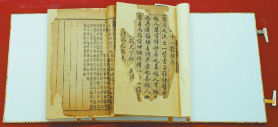 明刻本《陳伯玉文集十卷》收錄了唐代詩人陳子昂的作品,對于研究其文風具有極高意義。這本館藏文物為李一氓先生捐贈。修復時,袁東玨將書拆開,反面朝上,用毛筆蘸上糨糊,把相同材質(zhì)、色澤相近的補紙粘到破損部位,只保留2毫米的重疊部分,再把多余的補紙撕下。修復之前,書籍第一冊李一氓題寫的書簽,已布滿污垢,經(jīng)袁東玨巧手將書簽揭下修補洗凈后,書簽上原有的金粉露出了本色,微光閃閃。再后,袁東玨利用國畫顏料曙紅、鈦白、赭紅、墨色調(diào)配成藕荷色,染色宣紙補書皮,內(nèi)頁用毛太紙,溜口用皮紙染成相近顏色修補。為達到修舊如舊的效果,盡管該書還有版心斷裂等問題,但考慮到這些是鑒定版本的重要依據(jù),袁東玨并未過多干涉,保留了原樣。