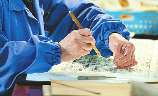 熟能生巧,修書破萬卷后,她和古籍建立了一種獨特的默契,“比如我現(xiàn)在做金鑲玉的鑲襯及折邊,200頁兩天就可以做完,書葉的厚薄、紙張潤度,靠著手摸就能感覺到?!?/p>