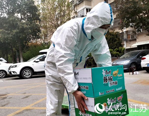 出不去的“外賣大哥”朱運(yùn)東幫著搬運(yùn)物資。受訪者供圖