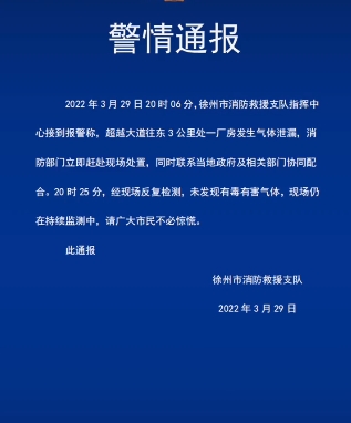 徐州市消防救援支隊(duì)在當(dāng)晚24時(shí)左右發(fā)布的警情通報(bào)中表示,3月29日20時(shí)06分,徐州市消防救援支隊(duì)指揮中心接到報(bào)警稱,超越大道往東3公里處一廠房發(fā)生氣體泄露,消防部門立即趕赴現(xiàn)場處置,同時(shí)聯(lián)系當(dāng)?shù)卣跋嚓P(guān)部門協(xié)同配合。20時(shí)25分,經(jīng)現(xiàn)場反復(fù)檢測(cè),未發(fā)現(xiàn)有毒有害氣體,現(xiàn)場仍在持續(xù)監(jiān)測(cè)中。
