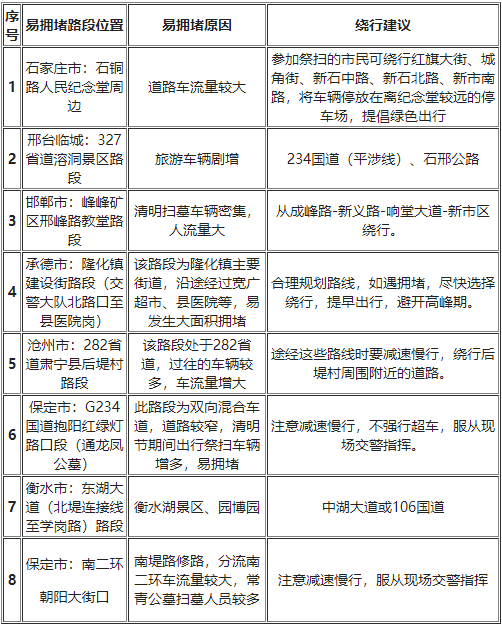 有可能出現(xiàn)大流量的站口:石家莊四個(gè)端口站、青銀趙縣口、京港澳七一口、大廣衡水北、首都環(huán)線(張涿段)野三坡、百草畔、百里峽。有可能出現(xiàn)擁堵的互通立交:京臺(tái)與京滬互通、新元與京港澳互通(南)。