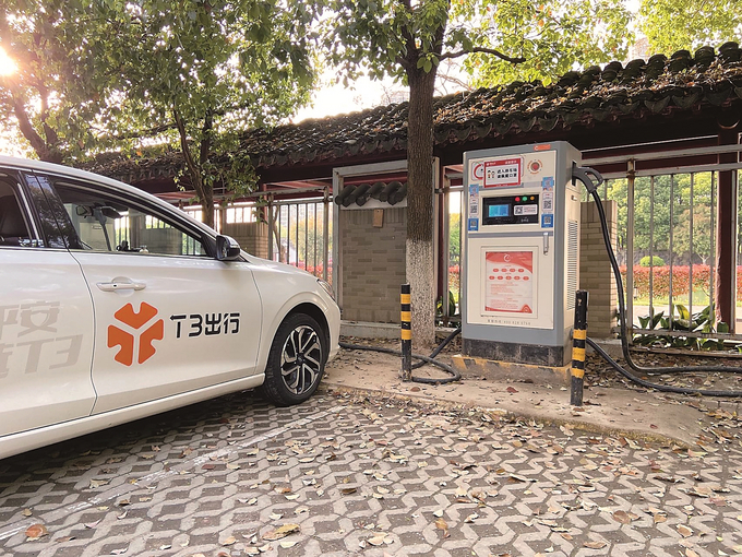 南京寶船聽濤廣場(chǎng)內(nèi),一輛新能源網(wǎng)約車正在充電。董翔 攝