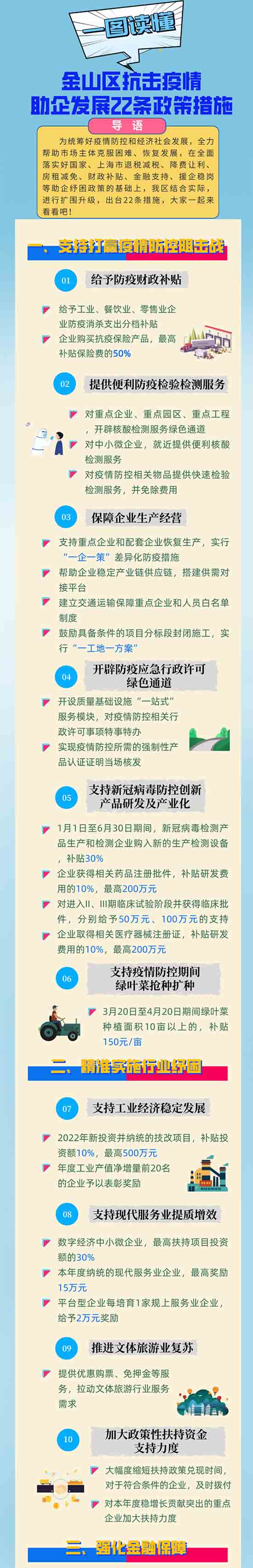據(jù)悉,為統(tǒng)籌好疫情防控和經(jīng)濟(jì)社會發(fā)展,全力幫助市場主體克服困難、恢復(fù)發(fā)展,在全面落實(shí)好國家、上海市退稅減稅、降費(fèi)讓利、房租減免、財(cái)政補(bǔ)貼、金融支持、援企穩(wěn)崗等助企紓困政策的基礎(chǔ)上,結(jié)合金山實(shí)際,進(jìn)行擴(kuò)圍升級,制訂《金山區(qū)抗擊疫情助企發(fā)展22條政策措施》?!?2條”既聚焦企業(yè)當(dāng)前面臨的“難點(diǎn)”“痛點(diǎn)”“堵點(diǎn)”,又考慮到疫情后企業(yè)加快發(fā)展的各項(xiàng)訴求,共計(jì)包括六大方面內(nèi)容,即支持打贏疫情防控阻擊戰(zhàn)、精準(zhǔn)實(shí)施行業(yè)紓困、強(qiáng)化金融保障、開展援企穩(wěn)崗、減輕企業(yè)負(fù)擔(dān)及優(yōu)化提升服務(wù),用實(shí)實(shí)在在的舉措,精準(zhǔn)幫助市場主體紓困解難,穩(wěn)定經(jīng)濟(jì)增長。