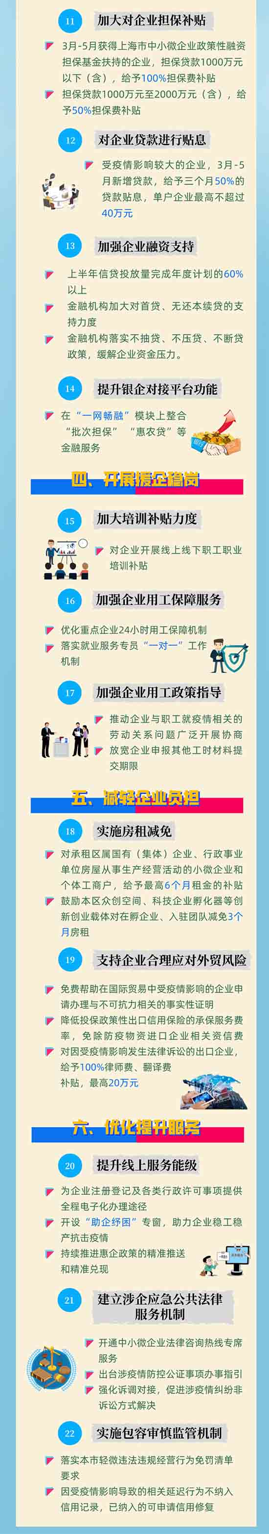 在優(yōu)化提升服務(wù)方面,“22條”還提出提升線上服務(wù)能級、建立涉企應(yīng)急公共法律服務(wù)機(jī)制及實(shí)施包容審慎監(jiān)管機(jī)制等3條措施。例如,充分發(fā)揮“一網(wǎng)通辦”優(yōu)勢,開設(shè)線上“助企紓困”專欄,提供區(qū)相關(guān)職能部門重點(diǎn)推出的一網(wǎng)暢融”“金山企業(yè)服務(wù)云”“科技點(diǎn)金”“才耀灣區(qū)”人才服務(wù)平臺等專欄,匯聚融資便利、資金扶持、企業(yè)用工、產(chǎn)業(yè)鏈供應(yīng)等方面的助企紓困措施,方便企業(yè)群眾辦事,助力企業(yè)抗疫情、穩(wěn)生產(chǎn)、穩(wěn)就業(yè)。