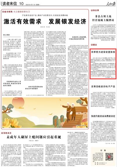 人民日?qǐng)?bào)刊發(fā)南通讀者來(lái)信:雨季前為避雷裝置體檢
