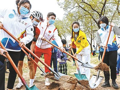 此次活動(dòng)由國(guó)家體育總局冬運(yùn)中心與北京市石景山區(qū)共同舉辦,是“冰雪向未來(lái)”全國(guó)群眾性冰雪主題活動(dòng)的第一站,也是北京冬奧會(huì)后冰雪項(xiàng)目國(guó)家隊(duì)公益服務(wù)計(jì)劃的首場(chǎng)活動(dòng)。圖為昨日,北京冬奧會(huì)冠軍武大靖(左三)在北京冬奧公園內(nèi)的“中國(guó)冰雪冠軍林”植樹。