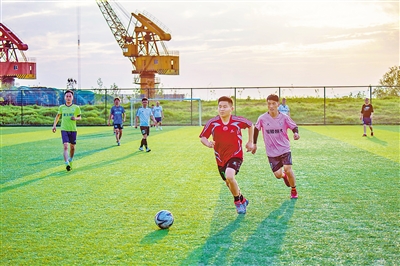 4月9日,在利用廢舊碼頭改造而成的安徽省銅陵市濱江生態(tài)體育公園,足球愛好者競逐綠茵,不遠(yuǎn)處的碼頭吊臂高高矗立。近年來,各地注重盤活城市空閑土地,通過新建或改擴(kuò)建體育公園、公共體育場館等,加大全民健身場地設(shè)施供給。