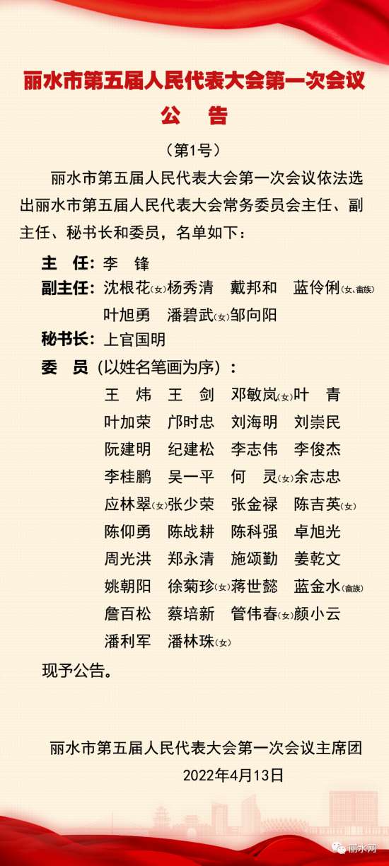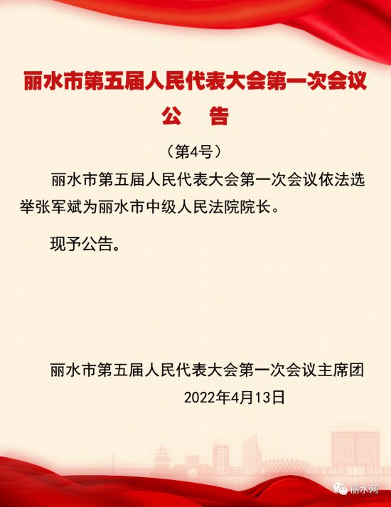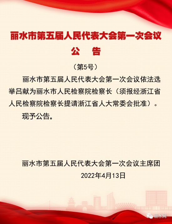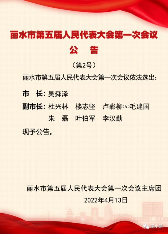 4月13日上午,麗水市五屆人大一次會議舉行第三次全體會議,選舉產(chǎn)生麗水市人大常委會主任、副主任、秘書長和委員,麗水市人民政府市長、副市長,麗水市監(jiān)察委員會主任,麗水市中級人民法院院長,麗水市人民檢察院檢察長。