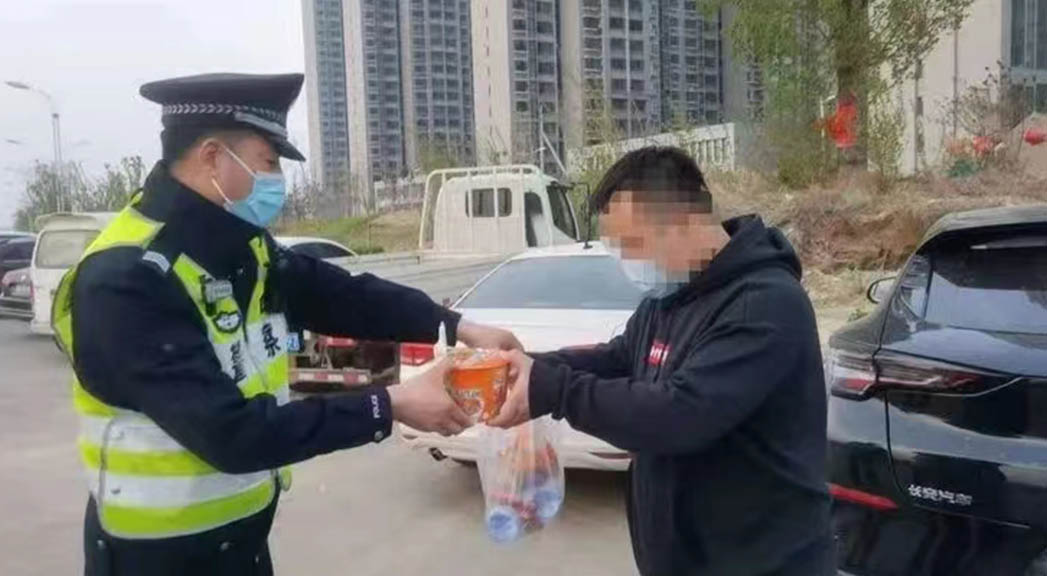 執(zhí)勤民警為滯留人員送來(lái)熱乎乎的飯菜。 邯鄲市公安局供圖