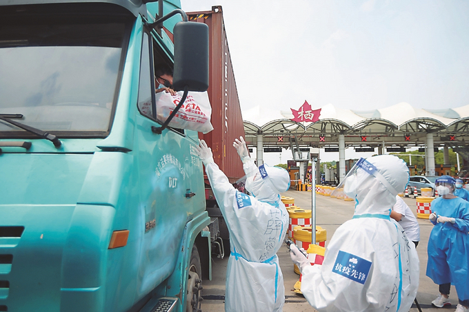 以“同心抗疫 我們?cè)谛袆?dòng)”為主題的貨車司機(jī)關(guān)愛(ài)活動(dòng)最近在我省多地開(kāi)展,志愿者們?yōu)樨涇囁緳C(jī)送去“抗疫愛(ài)心包”,提供暖心服務(wù)。圖為20日,在南京繞城高速棲霞收費(fèi)站出口,志愿者向貨車司機(jī)送上“抗疫愛(ài)心包”。本報(bào)記者 陳儼 攝