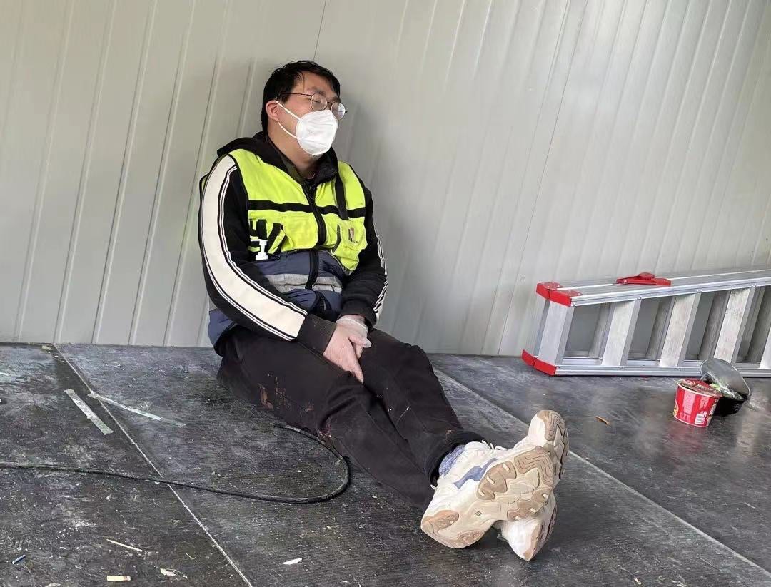 “3月底的上海,還有點冷,沒有被子蓋,我們就裹著衣服,每天只能睡不超過兩小時。”上海建工集團副總工程師王美華是施工現(xiàn)場為數(shù)不多的女性。現(xiàn)場24小時不停工,工人兩班倒,交班后就地鋪板睡覺,但應(yīng)急指揮部管理人員要隨時待命,解決現(xiàn)場各類問題,只能找間隙蜷縮在車里休息一下。