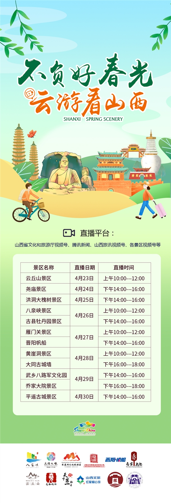 據(jù)了解,本次直播活動共有12家山西景區(qū)參與,包括平遙古城、云丘山景區(qū)、八泉峽景區(qū)、洪洞大槐樹景區(qū)、雁門關(guān)景區(qū)5家5A級景區(qū),以及堯廟景區(qū)、黃崖洞景區(qū)、武鄉(xiāng)八路軍文化園、古縣牡丹文化園、大同古城墻在內(nèi)的5家4A級景區(qū),還有喬家大院景區(qū)、晉陽帆船體驗(yàn)項(xiàng)目的加入,為本次直播活動增添了別樣的趣味。直播活動將從4月23日開始持續(xù)到4月30日,每天上午10:00—12:00、下午14:00—16:00、16:00—18:00,共3個時(shí)間段進(jìn)行景區(qū)重點(diǎn)旅游資源推介、春季踏青賞花線路、以及城市周邊游等主題產(chǎn)品介紹。