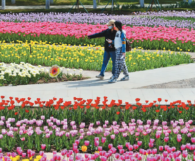 游客在河北省石家莊市植物園觀賞郁金香。張曉峰攝(人民圖片)