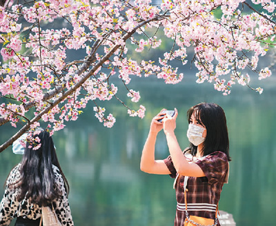 游客在江蘇省南京市中山植物園賞花拍照。蘇 陽攝(新華社發(fā))