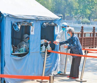 5月4日,北京西城區(qū)什剎海街道荷花市場(chǎng)核酸檢測(cè)現(xiàn)場(chǎng),工作人員引導(dǎo)老人通過(guò)綠色通道進(jìn)行核酸檢測(cè)。什剎海街道優(yōu)化點(diǎn)位設(shè)置,減少排隊(duì)時(shí)間。同時(shí)特別關(guān)注老人、兒童等群體,為他們開(kāi)辟綠色通道,進(jìn)一步提高采樣工作效率。