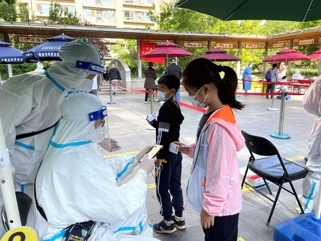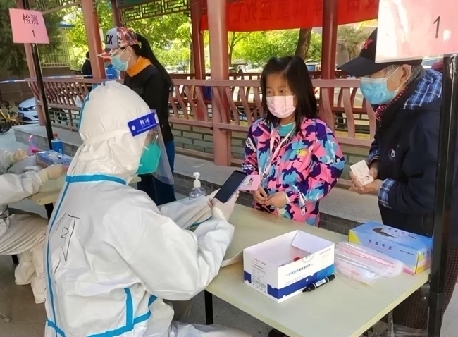 “請(qǐng)您掃碼出示健康寶信息。我來教您如何幫助小朋友代查健康寶狀態(tài)……”5月4日下午2點(diǎn),宋博皓在建國門街道朝陽門南小街16號(hào)樓南側(cè)通道的核酸檢測點(diǎn)忙碌著。