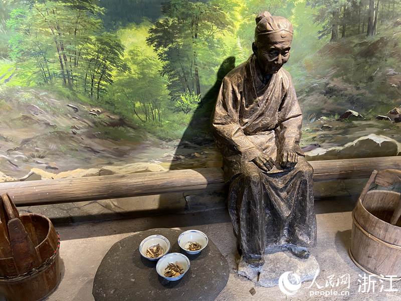 中國(guó)自古有施茶傳統(tǒng),鄉(xiāng)間有三里立茶亭、十里建長(zhǎng)亭施茶,供路人休憩的風(fēng)俗。在茶之俗展廳,記者看到了一比一還原的施茶場(chǎng)景:施茶者坐于亭內(nèi),面前是3碗裝有端午茶的茶碗,等待過往路人前來飲用。施茶的習(xí)俗也體現(xiàn)了松陽(yáng)人樂善好施的傳統(tǒng)美德。
