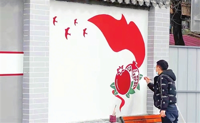 圖為專業(yè)人員對(duì)墻體進(jìn)行主題彩繪。朱明鑰 李朋林 攝影報(bào)道