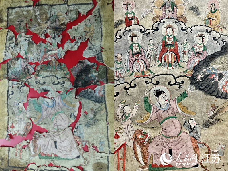前后三個(gè)月時(shí)間里,她幾乎每天工作12小時(shí),毛筆、糨糊、排筆、噴壺、棕刷……輪流上陣,只為撫平褶皺,拼合裂痕。最終,陳思燚“妙手回春”,讓188個(gè)紙漿團(tuán)殘片,還原成了一幅長(zhǎng)1.55米、寬0.6米的人物彩畫。陳思燚說(shuō),“這幅畫被撕成碎片,團(tuán)成一團(tuán)后環(huán)境相對(duì)封閉,一定程度上減弱了畫心顏色流失,能讓我最大限度地還原,這讓我很有成就感?!?/p>