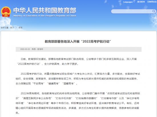 人民網北京5月25日電 (記者郝孟佳)日前,教育部印發(fā)通知,部署各地教育考試部門聯(lián)合網信、公安等多個部門和多家互聯(lián)網企業(yè),深入開展“2022高考護航行動”,全力護航高考,助力學子圓夢。