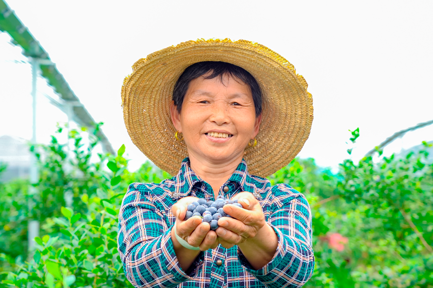 5月27日,江西省吉安市峽江縣巴邱鎮(zhèn)胡姚家村藍莓基地里,農(nóng)戶展示采摘的藍莓。鄧海明攝