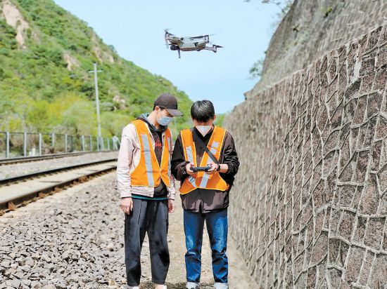 北京工務(wù)段職工利用無人機對高大山體等防洪處所進行隱患排查。
