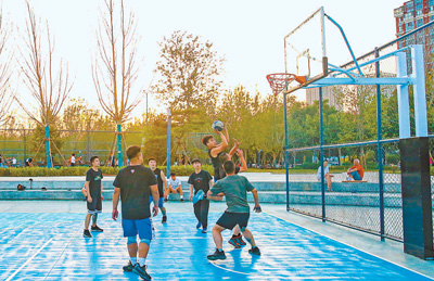 河北省石家莊市長安區(qū)拾光智慧體育公園里,市民正在打籃球。這座專業(yè)體育公園5月1日開放,以專業(yè)的運(yùn)動設(shè)施和優(yōu)美的健身環(huán)境,吸引眾多市民前來鍛煉。近年來,各地大力新建改建體育場地設(shè)施,為全民健身全面開展夯實(shí)基礎(chǔ)。