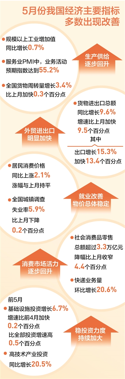 5月,我國(guó)經(jīng)濟(jì)運(yùn)行出現(xiàn)積極變化,主要指標(biāo)多數(shù)出現(xiàn)改善。