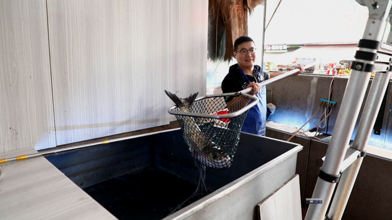 林加昌正忙著從魚(yú)箱里撈出活魚(yú)。文成縣委宣傳部供圖