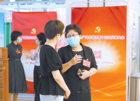 分團(tuán)討論休息時(shí),教育系統(tǒng)的代表在會議室外繼續(xù)交流。本報(bào)記者 賈同軍攝