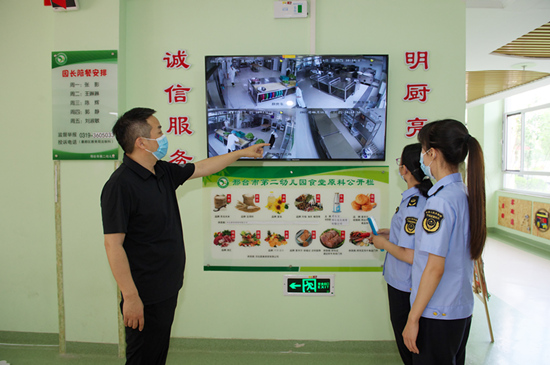 邢臺(tái)市市場監(jiān)管部門執(zhí)法人員到邢臺(tái)市第二幼兒園檢查“明廚亮灶”情況。 陳克家攝