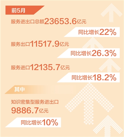 知識密集型服務(wù)貿(mào)易穩(wěn)定增長。前5月,知識密集型服務(wù)進(jìn)出口9886.7億元,同比增長10%。其中,知識密集型服務(wù)出口5602.4億元,增長13.6%;出口增長較快的領(lǐng)域是電信計算機(jī)和信息服務(wù)、其他商業(yè)服務(wù),分別增長18.5%、13.2%。知識密集型服務(wù)進(jìn)口4284.3億元,增長5.6%;進(jìn)口增長較快的領(lǐng)域是保險服務(wù),增速達(dá)74.2%。