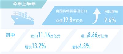 本報北京7月13日電?。ㄓ浾叨藕jP統(tǒng)計,今年上半年我國貨物貿易進出口總值19.8萬億元,同比增長9.4%。其中,出口11.14萬億元,增長13.2%;進口8.66萬億元,增長4.8%。