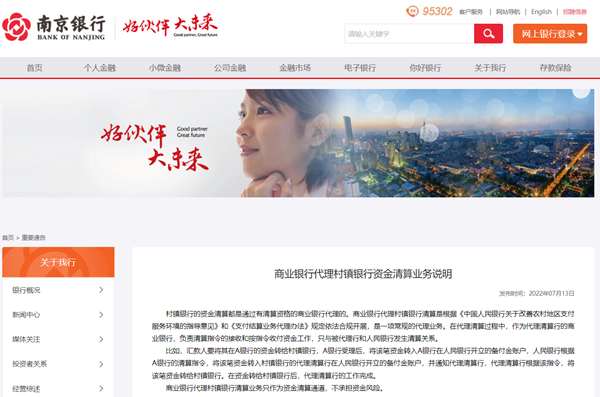 南京銀行回應(yīng)代理村鎮(zhèn)銀行清算業(yè)務(wù):不承擔(dān)資金風(fēng)險