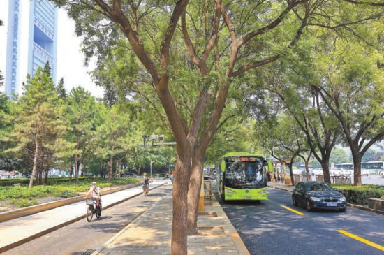 此外,在獨(dú)立的公交站臺(tái)外側(cè),利用原有綠地,新建非機(jī)動(dòng)車道和人行步道各一條,均為2.5米寬。自行車道采取外繞公交站臺(tái)方式,保障騎行路線安全、連續(xù)?!艾F(xiàn)在,從國(guó)貿(mào)橋到大望橋,自行車可以連續(xù)騎行,不再受公交車進(jìn)站影響?!币蠛平榻B,該工程于今年4月進(jìn)場(chǎng)施工,目前已完工。