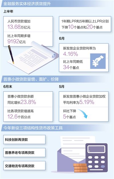 數(shù)據(jù)顯示,上半年,我國社會融資規(guī)模增量為21萬億元,同比多增3.2萬億元,人民幣貸款增加13.68萬億元,比上年同期多增9192億元。與此同時(shí),央行持續(xù)釋放貸款市場報(bào)價(jià)利率(LPR)改革潛力,1年期LPR和5年期以上LPR分別下降10個(gè)基點(diǎn)和20個(gè)基點(diǎn),6月份新發(fā)放企業(yè)貸款利率為4.16%,比上年同期低34個(gè)基點(diǎn),企業(yè)綜合融資成本穩(wěn)中有降,金融服務(wù)實(shí)體經(jīng)濟(jì)的質(zhì)量和效率明顯提升。