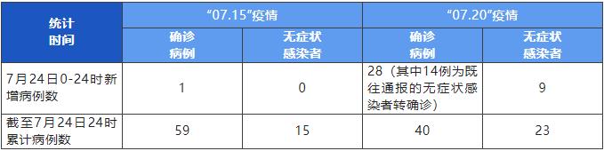 “07.15”疫情新增本土確診病例1例,無新增本土無癥狀感染者,系隔離管控中的密切接觸者。截至24日24時(shí),本起疫情累計(jì)報(bào)告本土確診病例59例、本土無癥狀感染者15例。