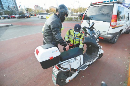 菜市口路口,西城區(qū)交通支隊(duì)民警對私自改裝電動自行車的違法行為進(jìn)行查處。本報記者 甘南攝(資料片)