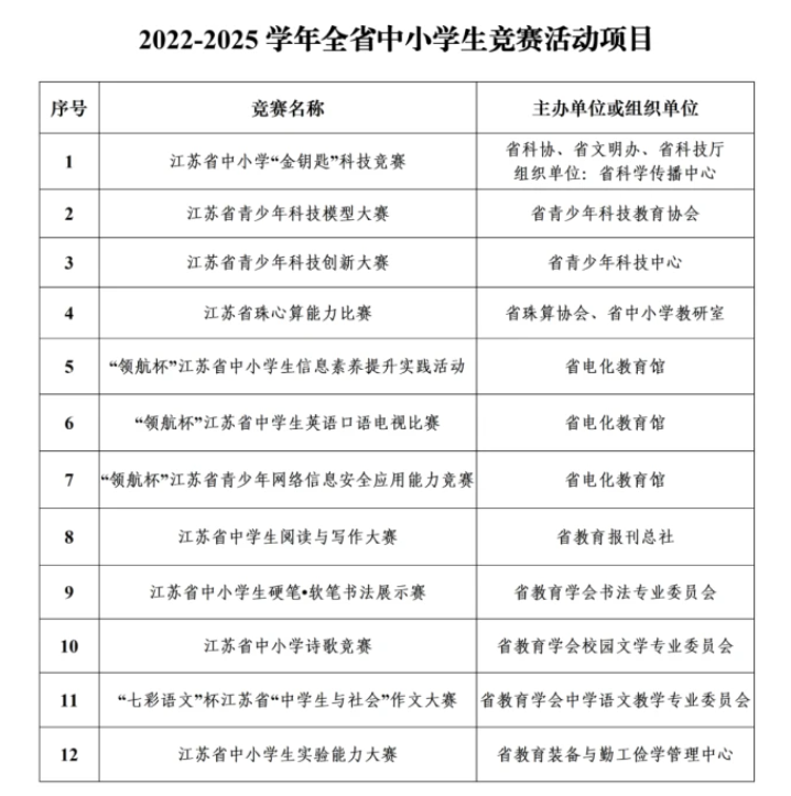 江蘇公布2022-2025學(xué)年中小學(xué)生競賽活動(dòng)項(xiàng)目