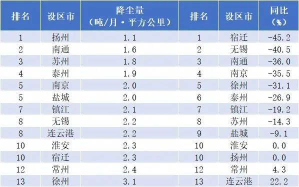 降塵量改善幅度由好到差依次排序為:宿遷、無錫、南通、南京、徐州、泰州、鎮(zhèn)江、蘇州、鹽城、淮安(揚州并列)、常州、連云港。