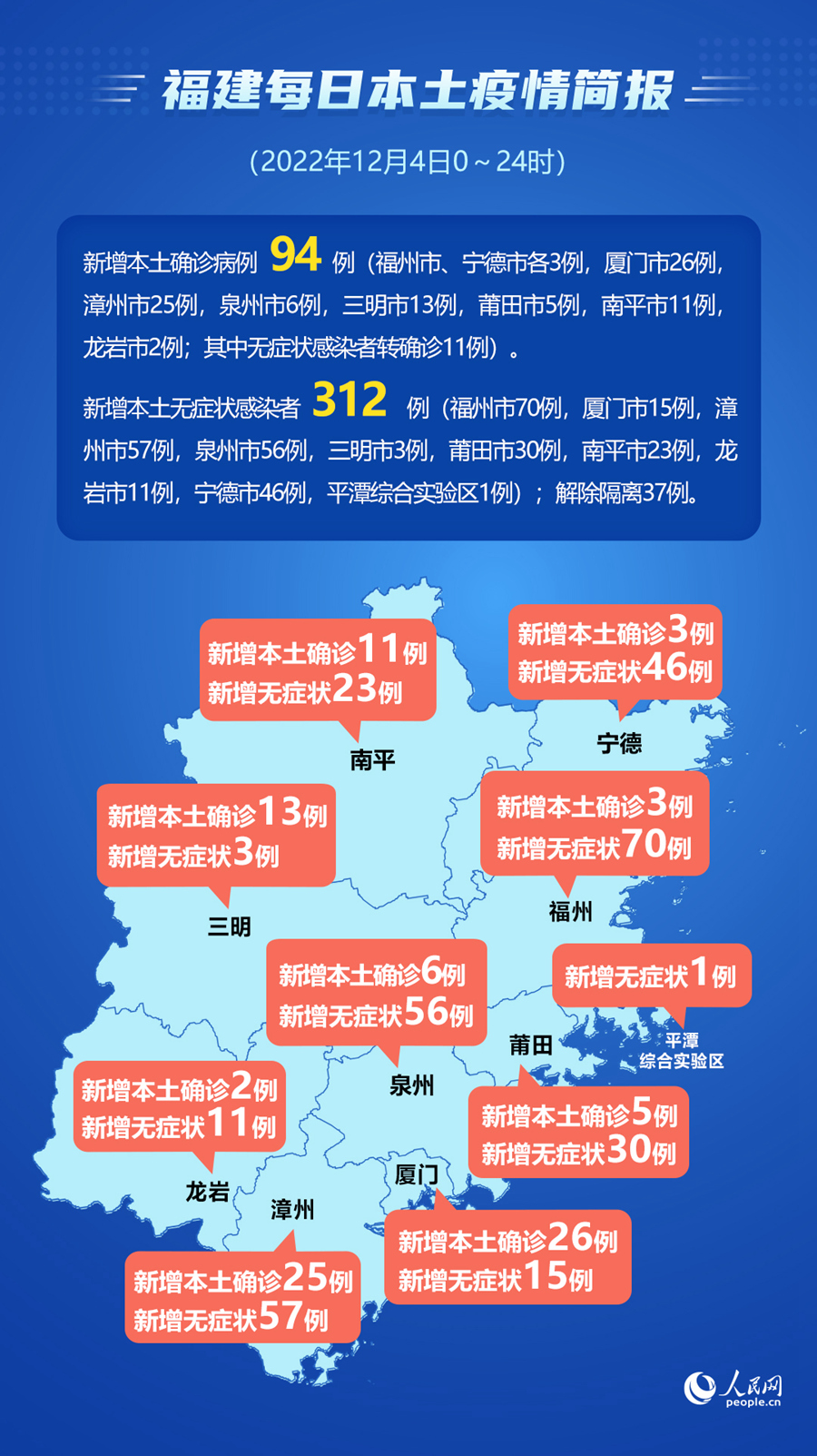 人民網(wǎng)福州12月5日電 (易雪妍、陳永整)據(jù)福建省衛(wèi)健委網(wǎng)站消息,12月4日0~24時,福建省報告新增本土確診病例94例(福州市、寧德市各3例,廈門市26例,漳州市25例,泉州市6例,三明市13例,莆田市5例,南平市11例,龍巖市2例;其中無癥狀感染者轉(zhuǎn)確診11例)。當(dāng)日報告新增本土無癥狀感染者312例(福州市70例,廈門市15例,漳州市57例,泉州市56例,三明市3例,莆田市30例,南平市23例,龍巖市11例,寧德市46例,平潭綜合實驗區(qū)1例);解除隔離37例。