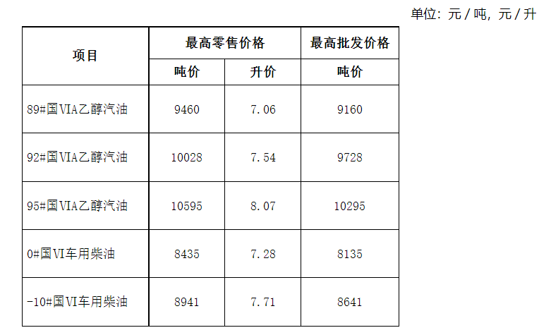 安徽省汽柴油最高零售和批發(fā)價格表