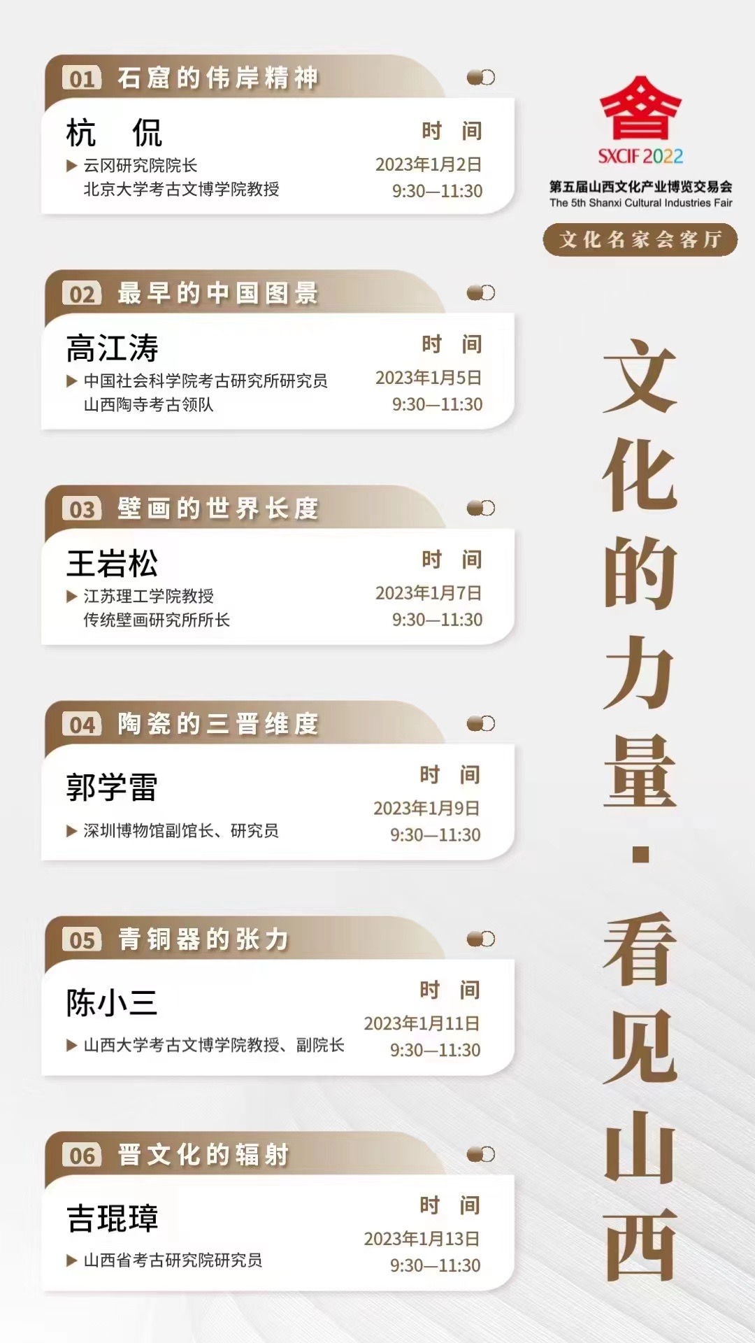 人民網(wǎng)太原12月30日電(記者麻潞)連日來(lái),正在進(jìn)行的第五屆山西文化產(chǎn)業(yè)博覽交易會(huì)(云上文博會(huì)),帶給了人們精彩的視聽(tīng)享受。從2023年1月2日起,云上文博會(huì)系列活動(dòng)之“文化名家會(huì)客廳”將正式上線,屆時(shí)省內(nèi)外文博名家輪番登場(chǎng),帶你“看見(jiàn)山西”。