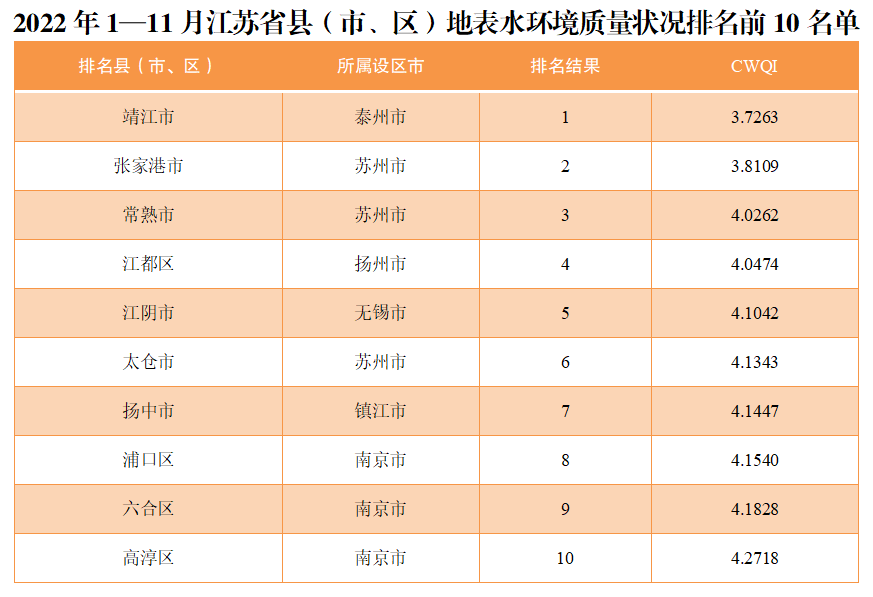 地表水環(huán)境質(zhì)量改善幅度相對較快的前10位(1—10名)依次是句容市、儀征市、丹陽市、吳江區(qū)、江陰市、江都區(qū)、宜興市、靖江市、昆山市、宿豫區(qū)。